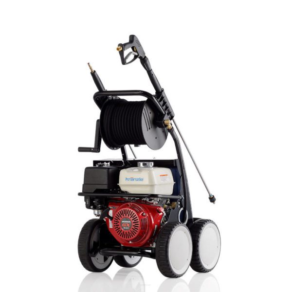 Podwozie umożliwiające jazdę po nierównym podłożu, duże koła z szerokim ogumieniem z pełnej gumy. Zintegrowany bęben na wąż ze składaną korbą i z 20 metrowym wężem wysokociśnieniowym w oplocie stalowym. Futerał na pistolet z bezpiecznym rozłączaniem, lanca Turbokiller i lanca z regulowaną dyszą. Duża pokrywa zabezpieczająca przed spalinami. Zderzaki ochronne przedni i tylny. Mimośrodkowy hamulec nastawny. Podwozie umożliwiające jazdę po nierównym podłożu z kołami odpornymi na przebicie. Podwozie ze stali szlachetnej. Przyjazny w serwisie silnik firmy Honda.