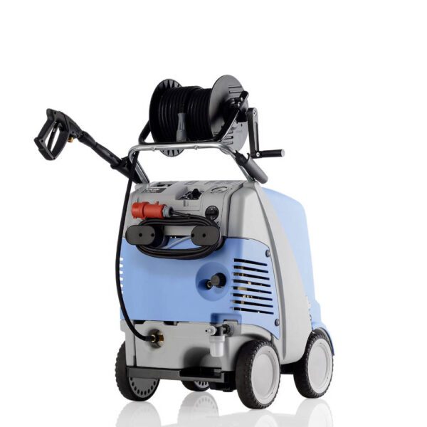 Kompaktowy format konstrukcyjny, ciśnienie robocze do 180 barów, duże koła z szerokim ogumieniem z pełnej gumy i ochrona przeciwuderzeniowa przednia i tylna – to cechy maszyn therm C na gorącą wodę firmy Kränzle. Seria therm C również składa się z trzech urządzeń, które każdorazowo można otrzymać z lub bez bębna na wąż.